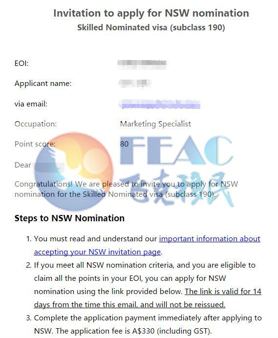 2022年12月9日遞交NSW190EOI,EOI分?jǐn)?shù): 80分(含190州擔(dān)保5分),2023年1月24日預(yù)獲邀!