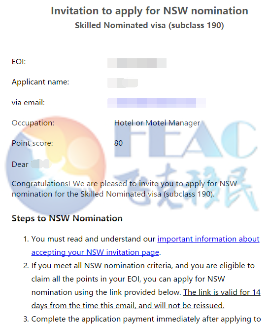 2023年1月28日遞交NSW190EOI,EOI分數: 80分(含190州擔保5分),2023年2月15日預獲邀!
