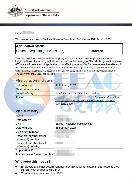 客戶最開始在我們這邊辦理了489于2018年順利下簽后,又找到我們辦理887,客戶489下簽后一直在澳洲做自雇外加一份兼職,在文案的專業建議和充足的材料準備下,客戶887無補料順利下簽。遞交時間2022年8月19日,下簽時間2023年2月16日。