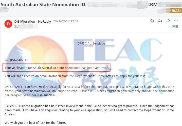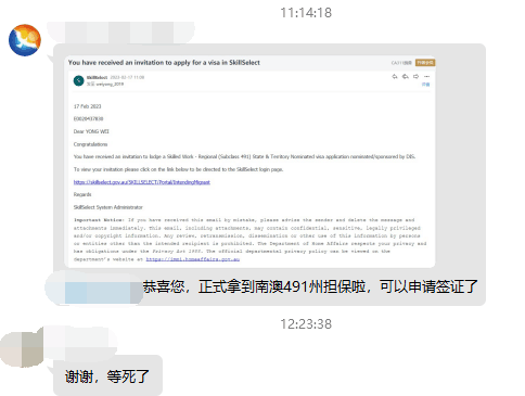 2023年1月22日遞交南澳491擔保申請,2023年2月17日獲得南澳491擔保。