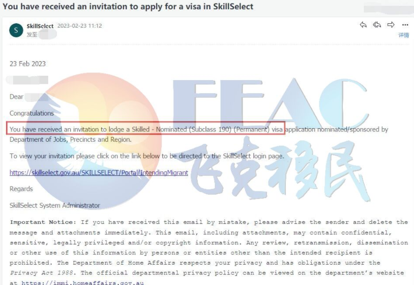 該客戶于2022年8月19日遞交維州190EOI,EOI分?jǐn)?shù): 80分(含190州擔(dān)保5分),2023年1月24日預(yù)獲邀;2023.1.30遞交提名,2023.2.23提名正式獲邀。