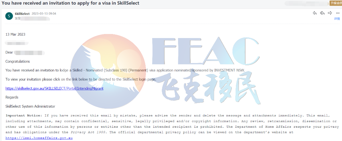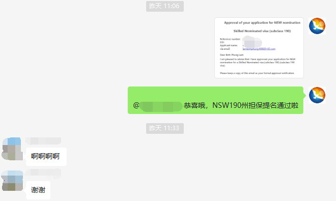 申請職業: Conference and Event Organizer ANZSCO Code 149311; EOI 75分(基礎分70分+州擔保5分);該客戶2023.1.30遞交NSW190EOI75分(基礎分70分+州擔保5分),2023.2.15預獲邀,2023.2.20遞交提名,2023.3.13正式獲邀。文案和顧問根據客戶情況,幫助客戶精準匹配NSW190通道,預獲邀后指導客戶準備提名材料,最終獲得正式邀請。