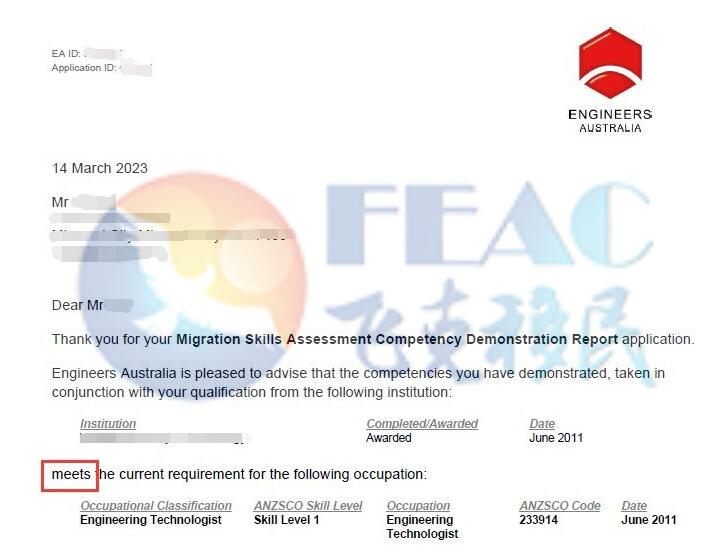 申請職業: 工程技師 ANZSCO 233914; 該客戶2023年2月15日加急遞交EA評估材料,2023年3月14日通過。文案根據以往經驗,指導客戶準備CDR素材并遞交EA評估材料,最后順利通過評估!