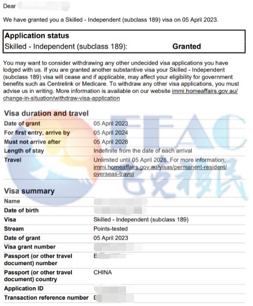 2022年8月24日獲邀,EOI分數85分,2022年11月8日提交簽證材料,文案幫客戶整理好所有資料,中間更新過澳洲的無犯罪證明,最終于2023年4月5日順利下簽。