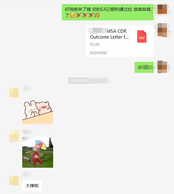 該客戶2023.7.5遞交,2023.8.25評估通過。在準備材料期間,文案悉心為客戶挑選合適的材料并多次加以核實,中間針對學歷的補料而學校又不能完全配合的情況下,也和客戶認真溝通清楚及時決斷,最終客戶碩士學歷也成功獲得承認并通過職評。