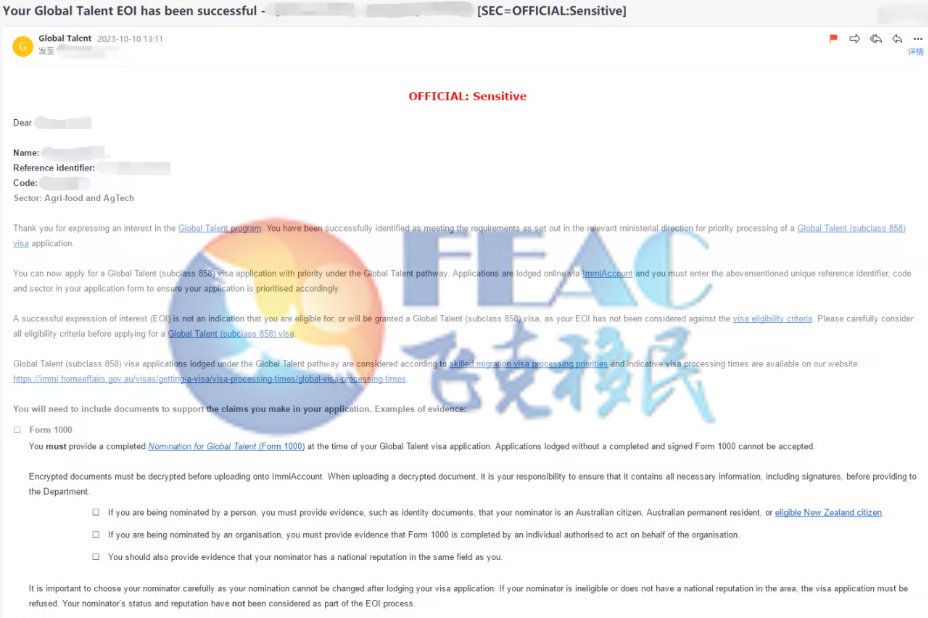 客戶2023年4月20日遞交GTI-EOI,2023年10月10日通過,客戶參與過很多申請(qǐng)領(lǐng)域相關(guān)的研究及項(xiàng)目,科學(xué)研究成果顯著,文案根據(jù)客戶提供的材料,豐富客戶個(gè)人成就,精心準(zhǔn)備相應(yīng)遞交材料,最終順利幫助客戶獲邀!