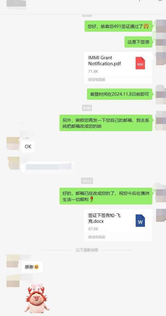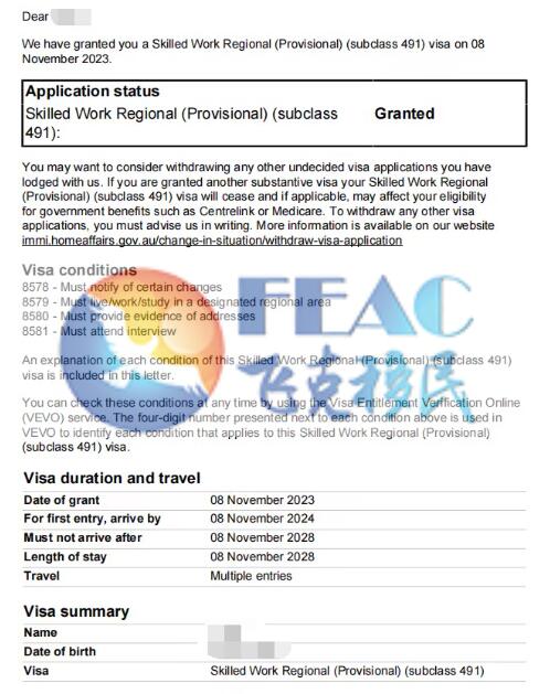 ACT491EOI: 100分, Matrix:80分。該客戶2022.9.21遞交提名2022.12.2獲邀,2023.1.17遞交簽證,2023.11.8下簽。客戶材料比較復雜,文案指導客戶準備職評/州擔/簽證遞交材料,簽證階段耐心指導客戶完成體檢,并提供澳無犯罪公證,最后幫助客戶順利拿到下簽信.