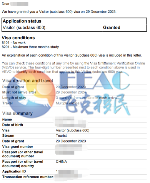 12月29日:恭喜Mr.Zhang??600簽證順利下簽!