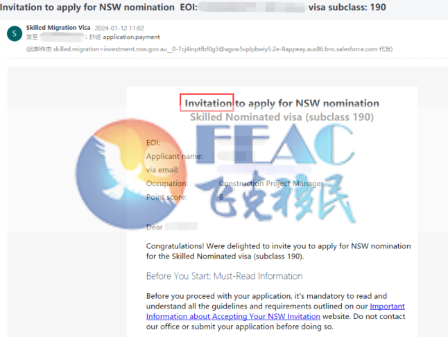 該客戶于2023年10月23日遞交EOI 70分,2024年1月12日預獲邀,分數80分(裸分75分+州擔5分)!