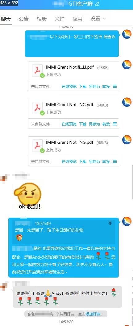 客戶所在的幾家公司背景不算很好,薪資也遠未達標,但是好在項目突出,文案在為客戶準備EOI申請材料期間與客戶詳細溝通,突出客戶優勢,GTI EOI階段經歷多次補料以后拿到了邀請函。于2023年2月10日遞交簽證申請,期間也遇到了多次不同審核官發出的補料通知,文案細心專業的為客戶制定遞交方案,最終于2024年1月26日,一家三口成功下簽。