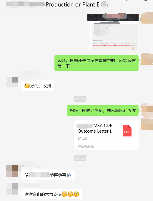 客戶于2024年2月日遞交職評,2024年2月29日通知補料, 2024年3月29日上傳補料文件,2024年4月24日通過。申請及補料過程中,文案耐心指導客戶準備文件,并針對客戶的CDR撰寫詳細的工作推薦信遞交,補料過程中撰寫相關工作證明解釋信,最終順利通過職評。