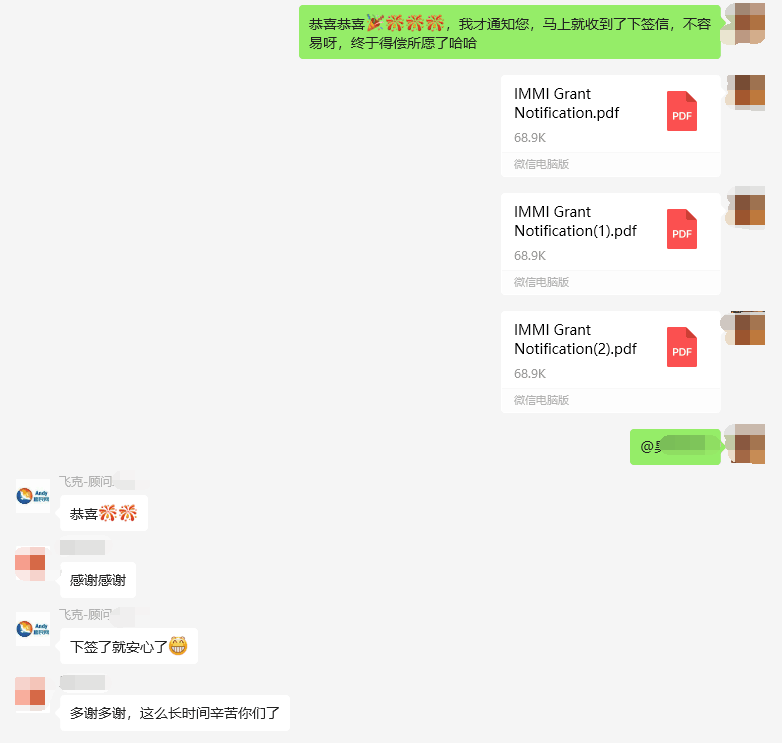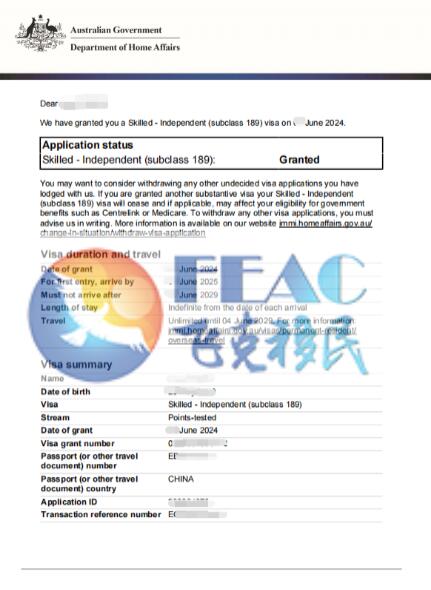該客戶于2019.11.13遞交EOI,2019.12.11EOI獲邀(獲邀分數80分),2019.12.26遞交簽證,期間由于疫情原因,客戶過橋簽過期無法返回澳洲,以及結婚生子等新的情況的出現,文案耐心細致的為客戶聯系移民局說明情況并配合移民局完成多次補料,最終于2024.6.4順利下簽。