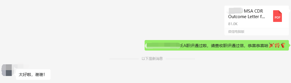 客戶于2024年5月17日遞交申請,2024年6月6日順利通過職業(yè)評估。申請過程中,文案耐心指導(dǎo)客戶準(zhǔn)備CDR相關(guān)資料,客戶積極配合準(zhǔn)備材料,最后無補(bǔ)料順利通過職評。