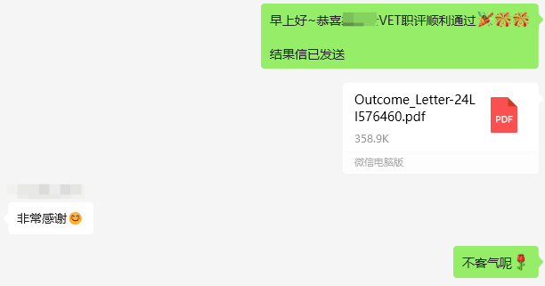 客戶(hù)于2024年9月11日遞交申請(qǐng),2024年9月12日加急付款,2024年9月16日通過(guò)。在材料準(zhǔn)備過(guò)程中,文案積極指導(dǎo)客戶(hù)提供職評(píng)素材,并為客戶(hù)撰寫(xiě)相應(yīng)的推薦信,客戶(hù)積極配合,最終無(wú)補(bǔ)料無(wú)電調(diào)順利通過(guò)職評(píng)。
