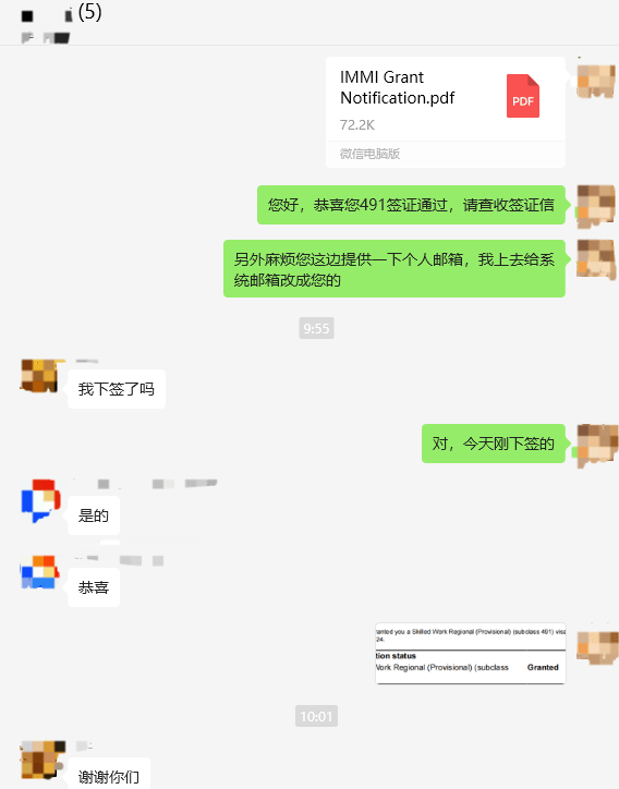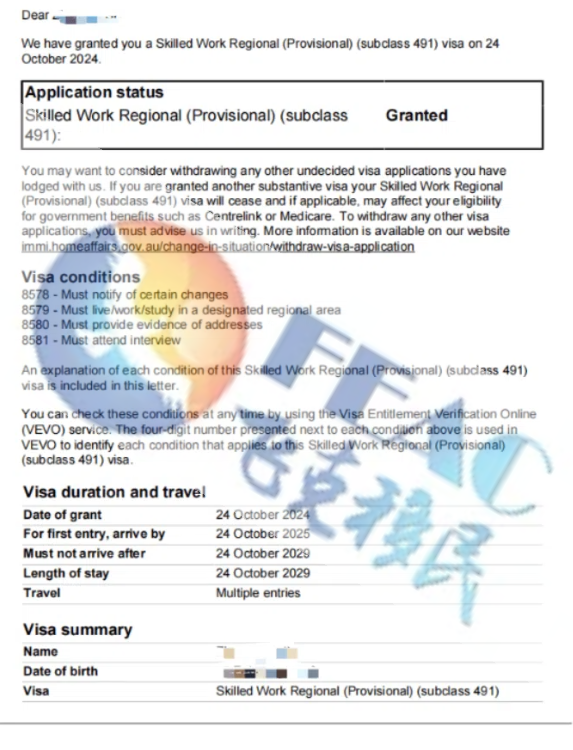 該客戶于2023.3.24遞交RDA, 2023.4.17日NSW491獲邀(獲邀分數80分),2023.005.10遞交簽證,2024.10.24順利下簽。申請過程中,文案耐心指導客戶提供相關材料文件并整理遞交,更新補料后,最終幫助客戶順利通過簽證。