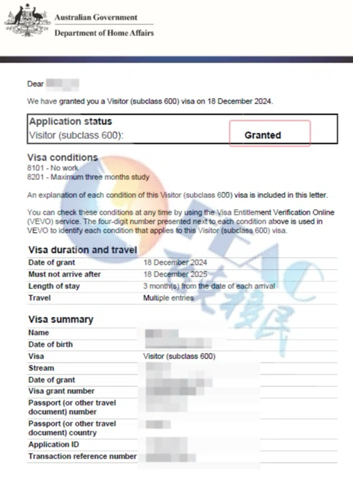 該客戶2024.12.13遞交旅游簽,2024.12.18順利下簽。