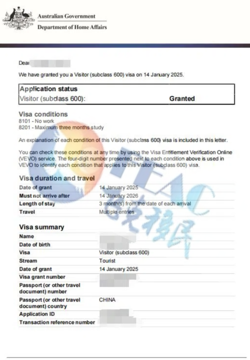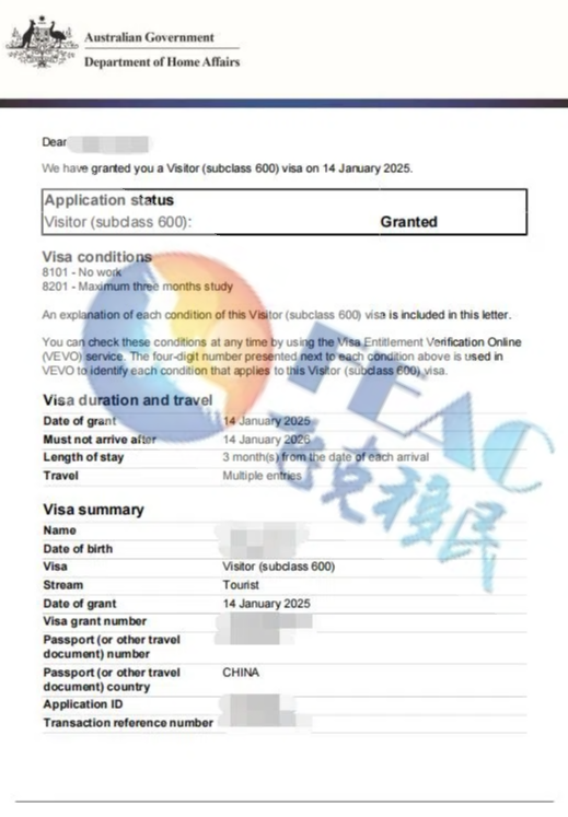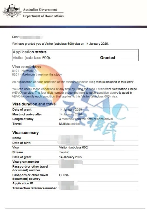 該客戶2025.1.3遞交旅游簽,2025.1.14順利下簽。
