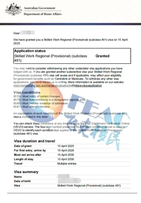 4月15日:恭喜Ms. Zhang 491簽證順利下簽!(境外)