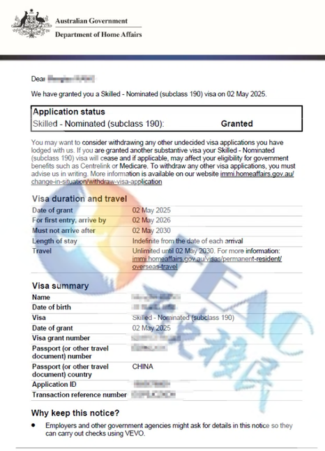 5月2日:恭喜Ms. Sun 及配偶190簽證順利下簽!(境外)