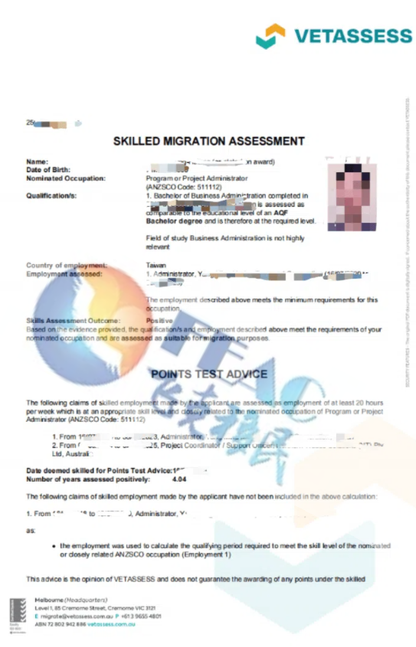 該客戶2025.4.8遞交,2025.5.14通過。申請過程中,客戶積極配合準備材料,文案耐心指導,及時檢查篩選客戶提供的材料,并撰寫詳細推薦信仔細梳理上傳,最終順利通過職業評估。
