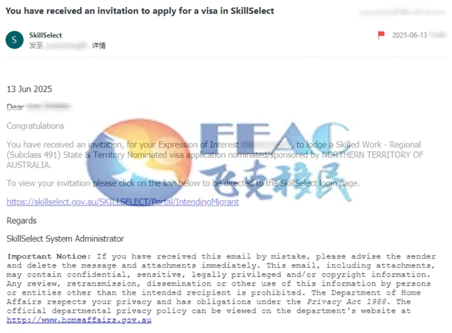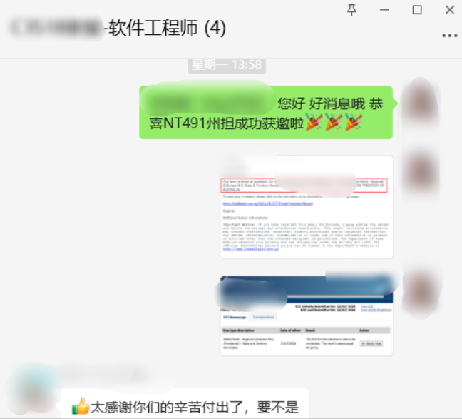 該客戶于2024.07.25遞交NT州擔申請,2025.6.13正式獲邀。文案耐心指導客戶準備州擔材料并遞交,最后幫助客戶順利通過提名,可以遞交簽證啦!