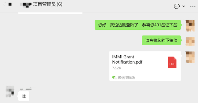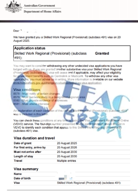 8月20日:恭喜Mr. Zhang 491簽證順利下簽!(境外)