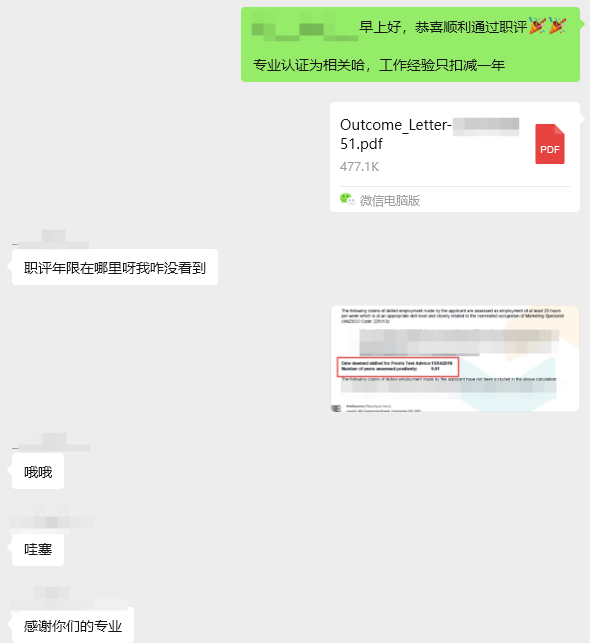 該客戶于2025年7月22日遞交職評申請,2025年9月22日通過。申請過程中,文案根據客戶工作背景耐心指導客戶提供材料,撰寫詳細的推薦信遞交申請,最終幫助客戶順利通過職評。