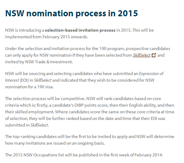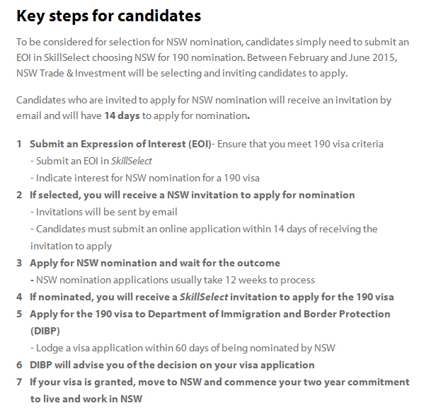原文地址:http://www.trade.nsw.gov.au/live-and-work-in-nsw/visas-and-immigration/skilled-nominated-migration-190/nsw-nomination-process-in-2015 。