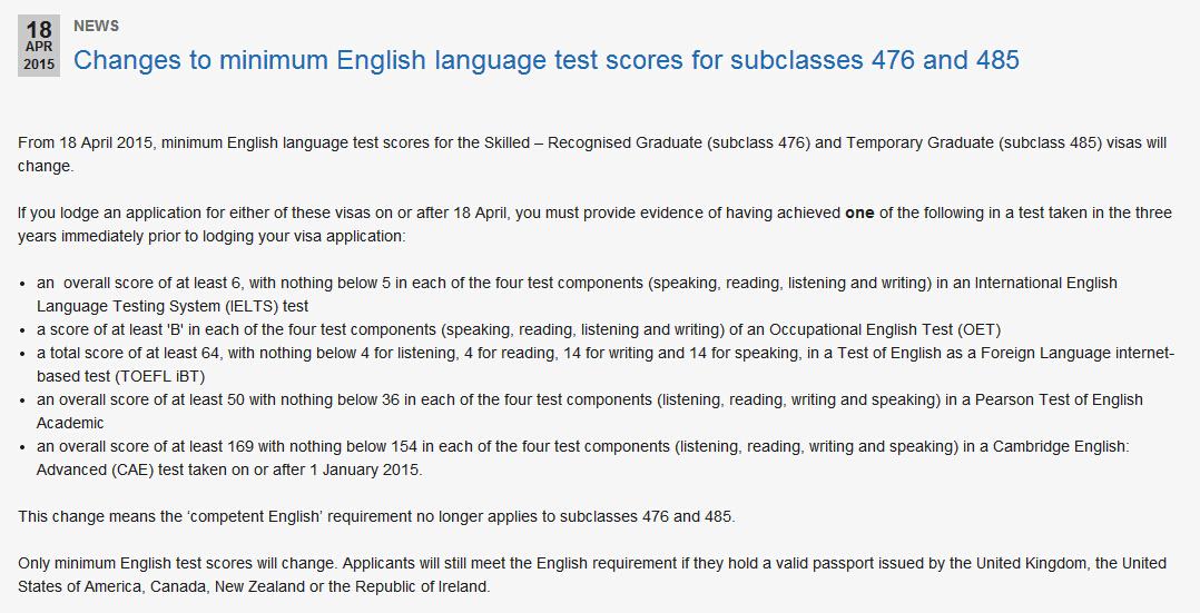 4月18日起遞交的畢業(yè)生簽證 476 和 485 雅思要求調(diào)整為 IELTS 總分6,單項(xiàng)不低于5,有效期3年。
