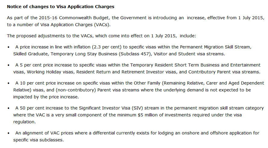 隨著2015-2016年聯(lián)邦預(yù)算的出臺(tái),移民局將于2015年7月1號(hào)開始酌情上調(diào)部分簽證申請費(fèi)。