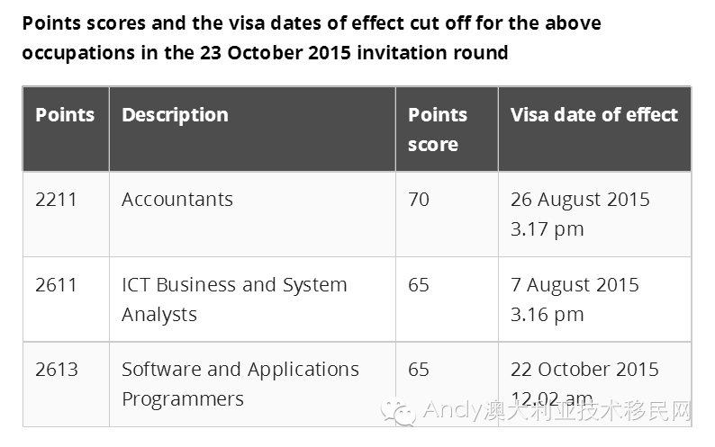 The points score and the visa date of effect cut-off for the above occupations in the 23 October 2015 invitation round is as follows. Below points score and visa date of effect is for Skilled Independent (subclass 189).