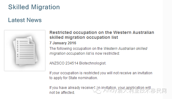 1月7日ANZSCO 234514 Biotechnologist 調整為restricted,申請此職業將不能獲得新的州擔保邀請,已獲得邀請的申請者不受影響。