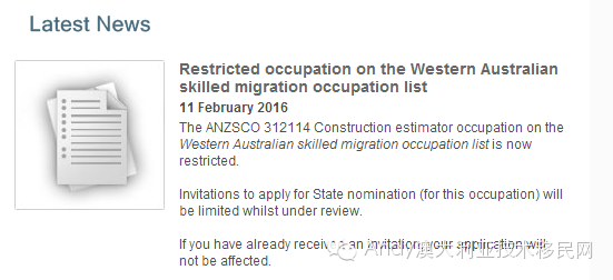 2月11日ANZSCO 312114 Construction estimator 調整為restricted,申請此職業將不能獲得新的州擔保邀請,已獲得邀請的申請者不受影響。