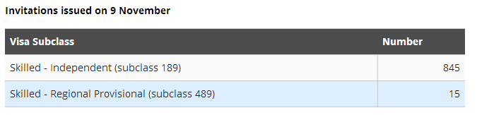 移民局今日發布了11月9日EOI邀請的官方結果報告。該輪邀請189配額邀請了845個,(subclass 489)親屬邊遠地區擔保邀請了15個。