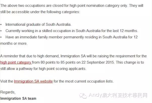 9月11日的時候,ANDY技術(shù)移民網(wǎng)給大家播報過,從9月22號起,南澳申請高分類別分?jǐn)?shù)從80分提高到85分。
