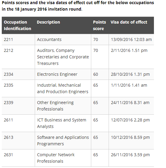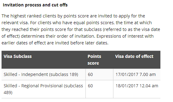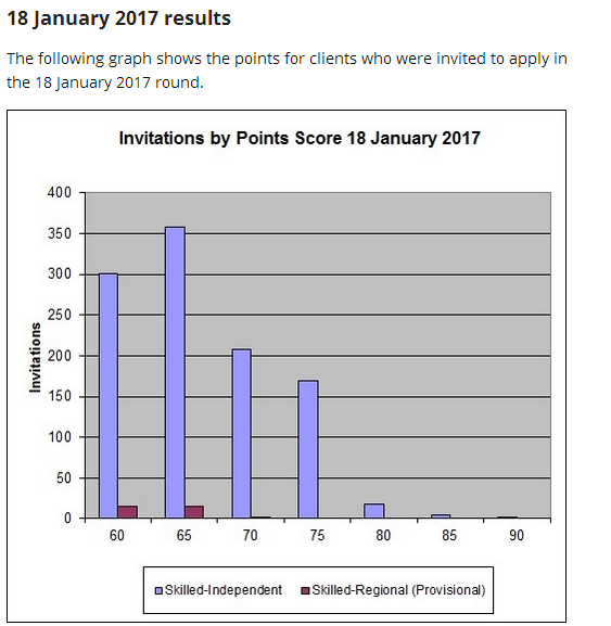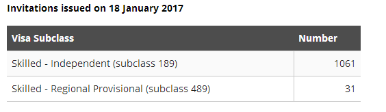 今日移民局發布了2017年1月18日EOI邀請的官方結果報告。該輪189配額邀請了1061個,(subclass 489)親屬邊遠地區擔保邀請了31個。