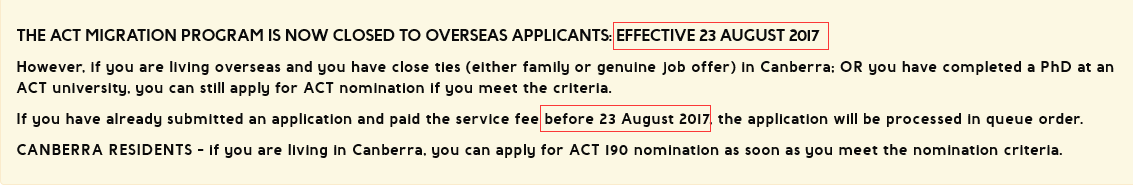 據最新消息,從2017年8月23開始,堪培拉政府針對海外申請者關閉州擔保申請(有堪培拉親屬,真實工作offer,或者此前是堪培拉PhD畢業生不受影響)。