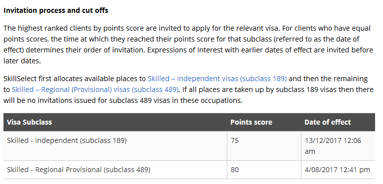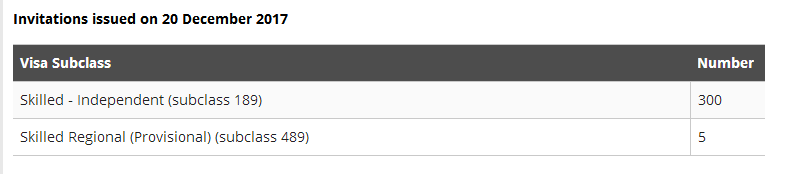 今日,移民局更新了2017年12月20日的EOI邀請官方報(bào)告,這也是2018年第一次更新EOI邀請的官方數(shù)據(jù)。然而,該輪189獨(dú)立技術(shù)移民的邀請人數(shù)依舊僅有300人, 489偏遠(yuǎn)地區(qū)親屬擔(dān)保僅有5人。 以下是官網(wǎng)數(shù)據(jù)↓↓↓