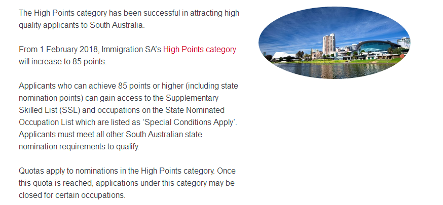職業在補充職業列表(SSL)或州擔保職業列表(State Nominated Occupation)上,狀態為‘Special Conditions Apply’的申請者,移民分達到85分以上,符合所有南澳州擔保的要求,將會有幸得到南澳的邀請。