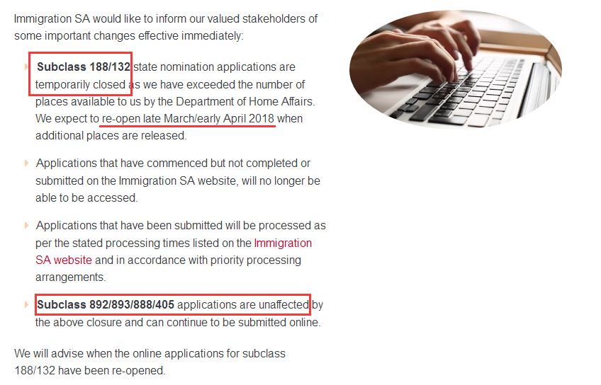 今日,南澳州政府在其官網(wǎng)發(fā)布通知稱,由于申請(qǐng)人數(shù)過(guò)多,南澳政府決定暫時(shí)關(guān)閉188類和132類投資移民簽證申請(qǐng),預(yù)計(jì)將于3月底或4月初重新開(kāi)放申請(qǐng),具體時(shí)間等候通知。892/893/888/405類別簽證不受此臨時(shí)關(guān)閉政策影響,仍可繼續(xù)申請(qǐng)。