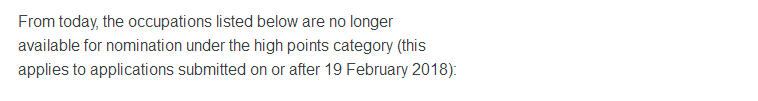另外,下列職業自2018年2月19日起不再接受高分類別的申請者: