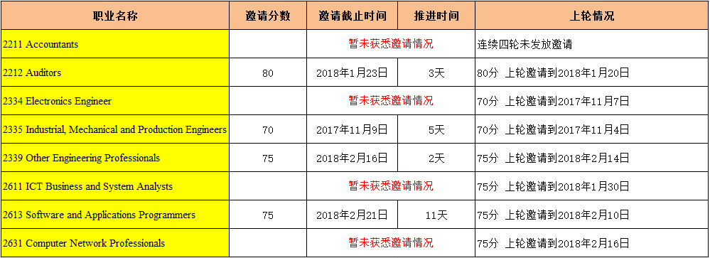 今日凌晨, 內政事業部(原移民局)發放了2018年三月份第一輪EOI邀請。本輪邀請的數量大概還是和前幾輪一致保持在300個(也可能更少)。小編根據內部獲邀信息及各移民群中朋友的信息統計本輪獲邀情況如下: