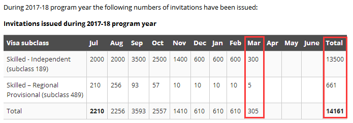 2017-18年度截至本輪:189獨立技術移民共邀請了13500人,489偏遠地區親屬擔保為661人。