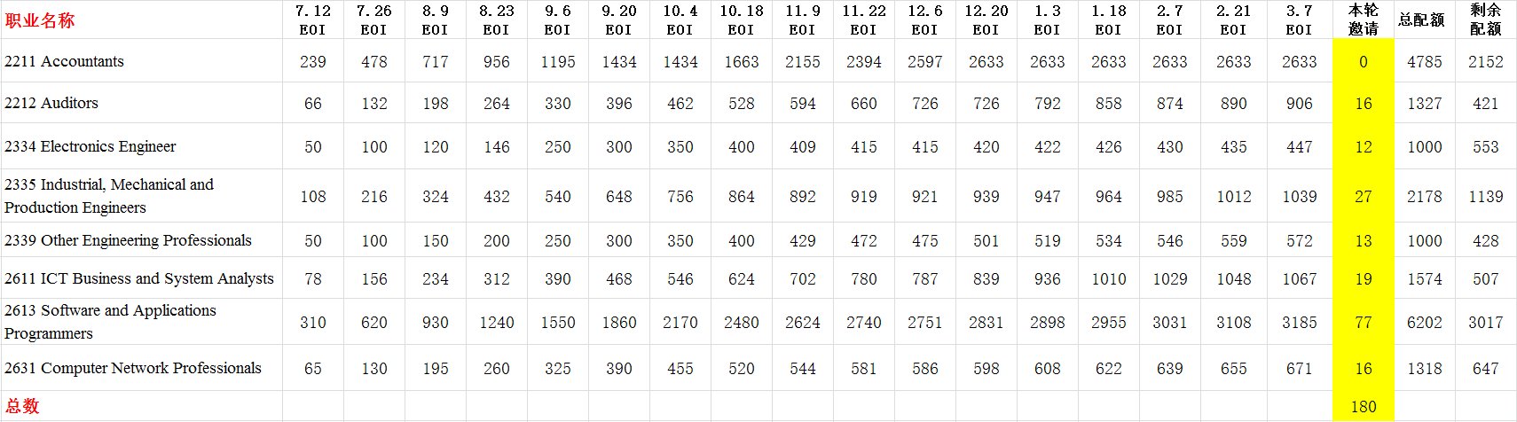本輪還是延續了之前幾輪的300個配額,絕大多數獲邀分數還是75分,最低分數是70,個別熱門職業如會計本輪繼續沒有發放邀請,并有可能后面也不會發放的趨勢。本輪大多數熱門職業并沒有按照pro rata標準發放,所剩的配額還很多。預計后面幾個月有很大希望會增加發放邀請的數量,我們一起拭目以待吧!希望移民朋友要保持好心態,積極去湊分,爭取早日獲邀。