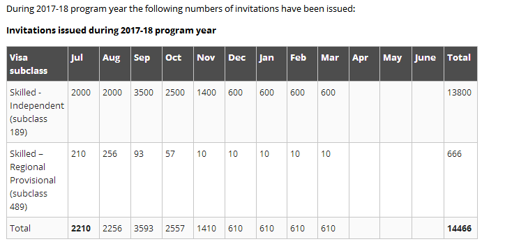2017-18年度截至本輪:189獨立技術移民共邀請了13800人,489偏遠地區親屬擔保為666人。