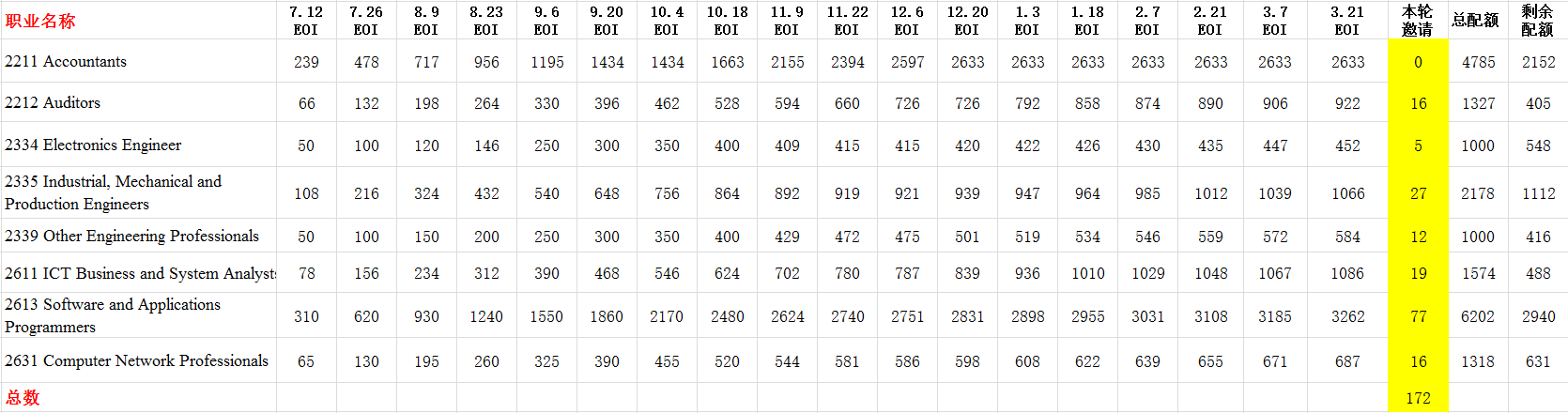 本輪還是延續了之前幾輪的300個配額,絕大多數獲邀分數還是75分,最低分數是70,個別熱門職業如會計本輪繼續沒有發放邀請,而且很有可能后面也不會發放。本輪大多數熱門職業并沒有按照pro rata標準發放,本財年僅剩5輪邀請了,按此情形今年的總配額肯定用不完。還在等待和觀望的移民朋友請保持樂觀的心態,抓緊時間提高英語成績或通過配偶加分、工作經驗加分等提高分數才是當下最重要的事情。