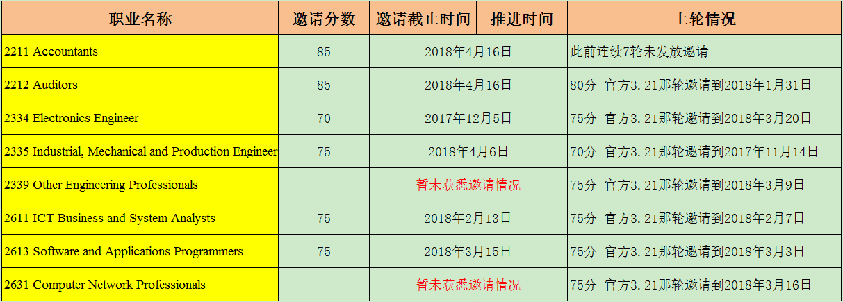 2018年4月4日的EOI官方報(bào)告還未公布,今日凌晨,澳大利亞內(nèi)政部就發(fā)放了2018年四月份第二輪EOI邀請。本輪邀請的數(shù)量大概還是和前幾輪一致保持在300個(gè)。小編根據(jù)內(nèi)部獲邀信息及各移民群中朋友的信息統(tǒng)計(jì)本輪獲邀情況如下: