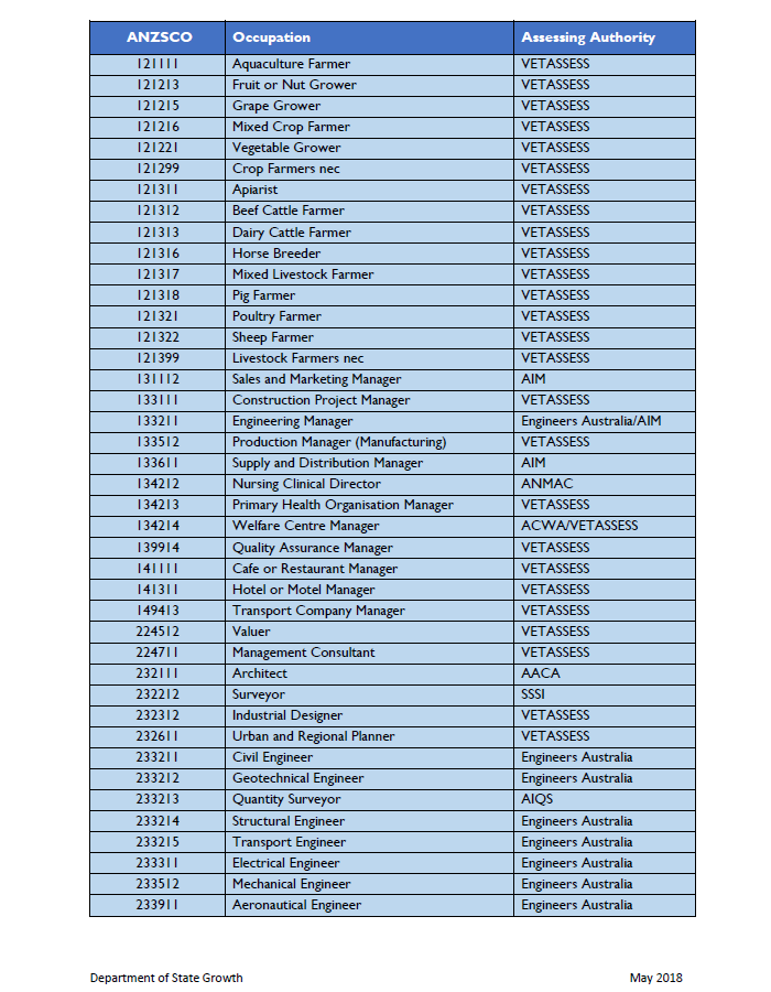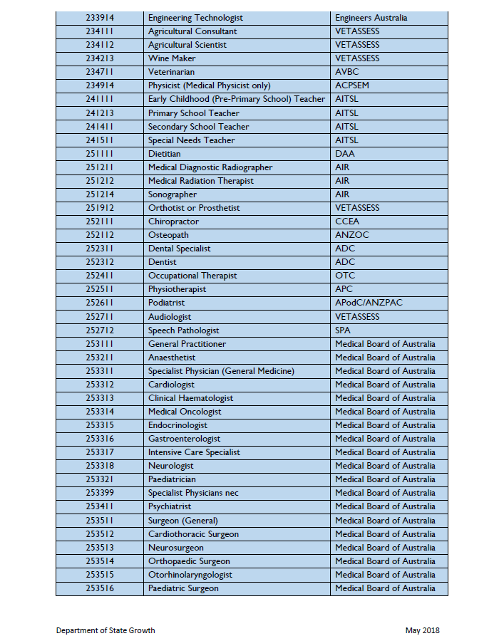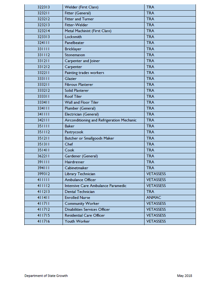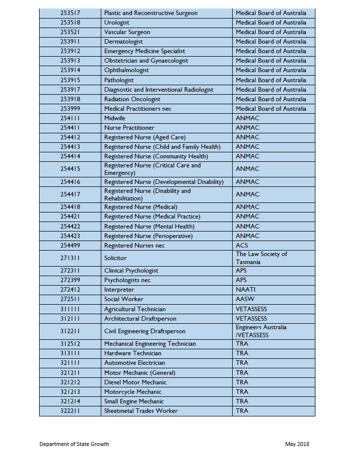我們可以看到,刪除的10個(gè)職業(yè)均為醫(yī)療行業(yè)職業(yè),看來(lái)塔州目前醫(yī)療行業(yè)技術(shù)人員缺口已經(jīng)滿足,不再稀缺。下面我們來(lái)看看塔斯馬尼亞本次5月份更新的技術(shù)移民職業(yè)列表: