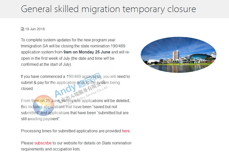 今日,南澳州政府在其官網發布通知稱:為迎接新財年,南澳政府將升級申請系統,6月25日早上9點起將關閉190和489州政府提名,7月第1周再開放申請,但具體日期等待通知。