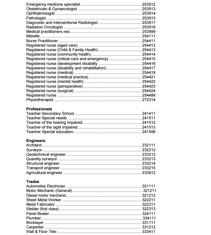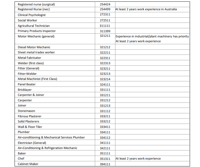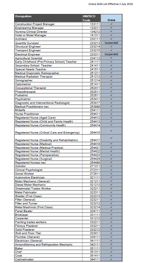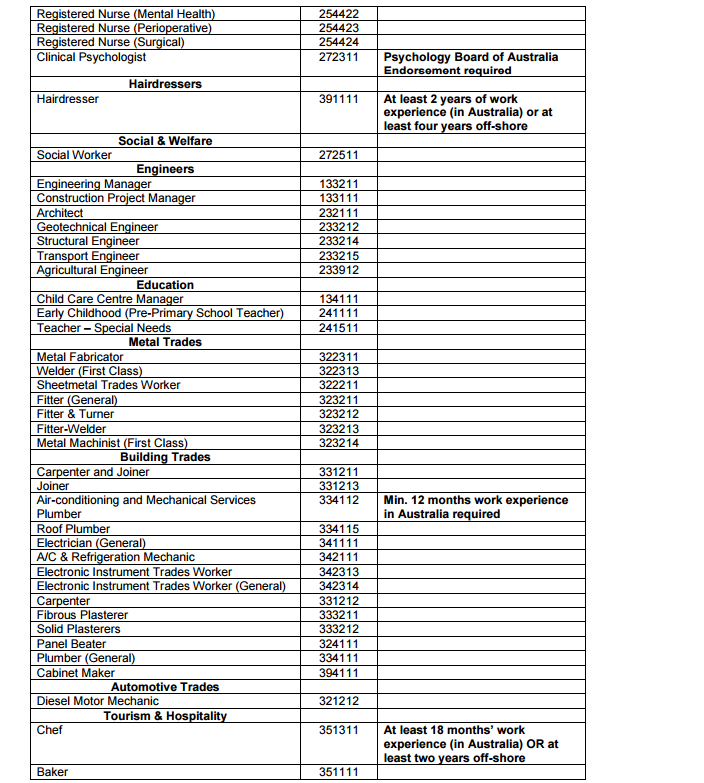新公布的職業列表暫停了QuantitySurveyor和Electrical Engineer這兩個職位,州政府將不再接受這兩個職位的申請。但是其他專業包括注冊護士,幼教,中學教師,社工等職業依然在列,并且這些職業在Orana不需要有工作經驗,分數滿足裸分55即可遞交申請!下圖是最新公布的Orana地區可以申請489簽證的職業列表。